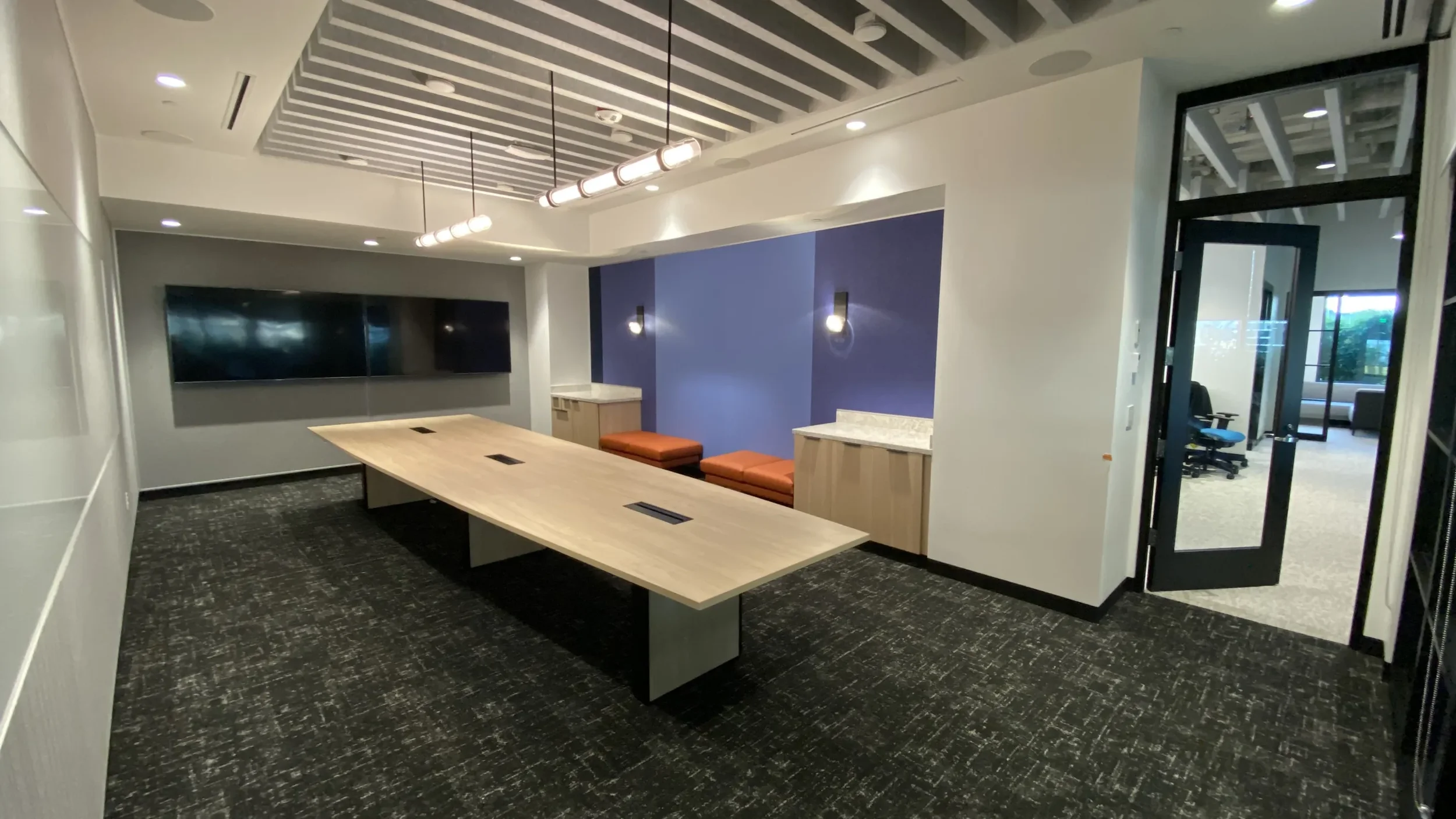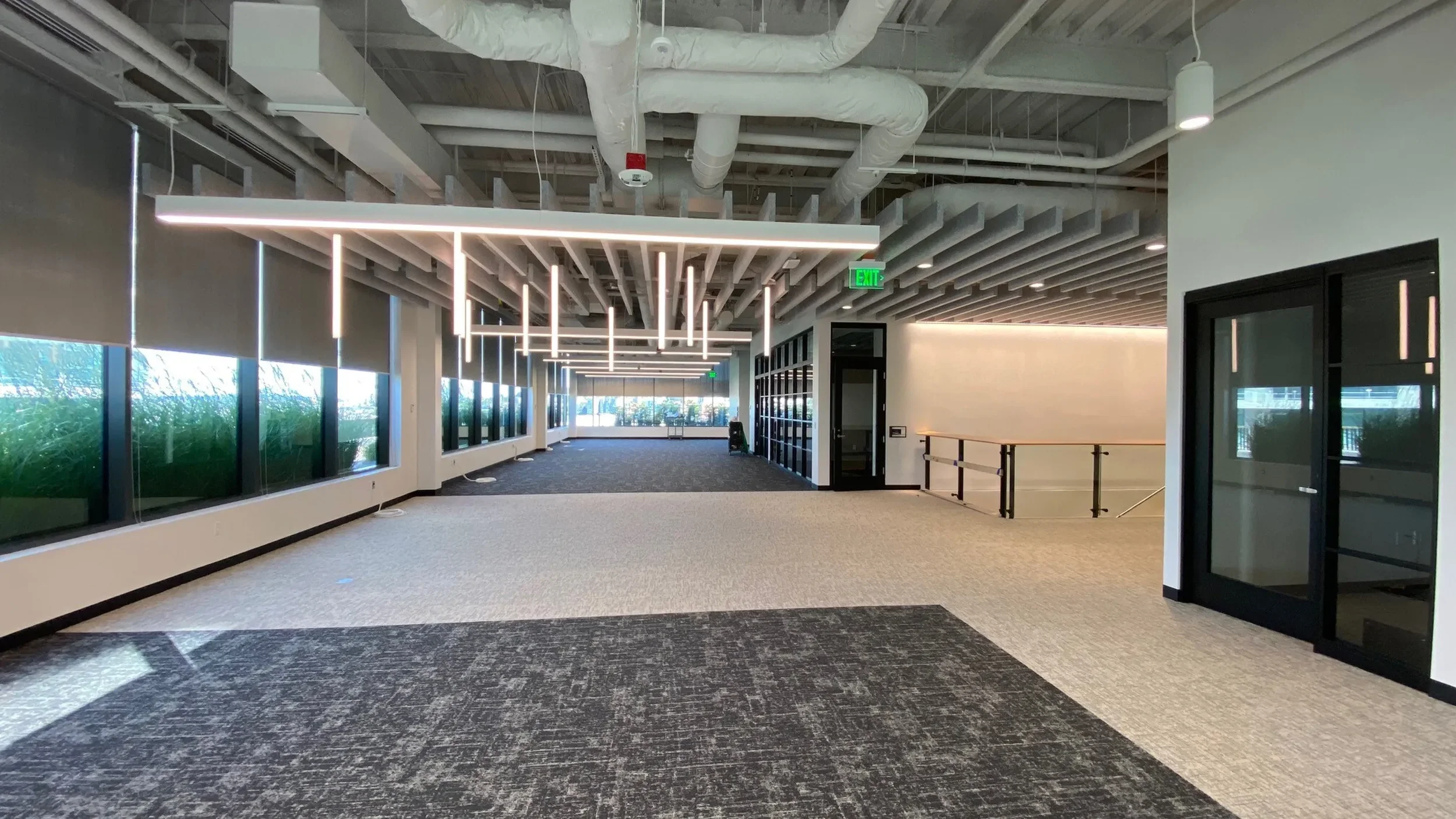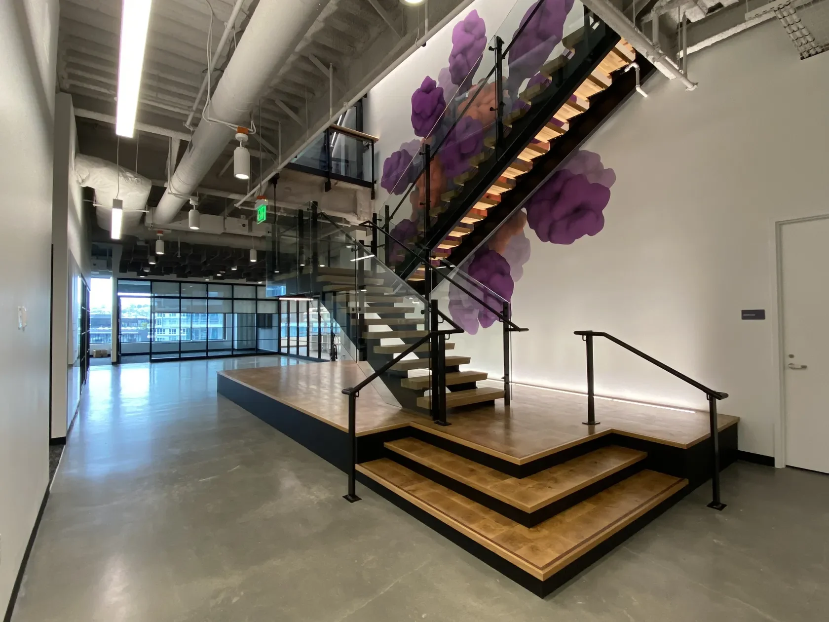 The new clean and modern space features a custom communicating stair, Class-A office space, conference rooms, and high-functioning laboratories.